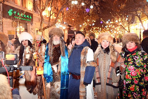 2024年1月21日晚,哈尔滨,来自内蒙古科尔沁草原的蒙古族汉子巴图,来到中央大街与我市的朋友大漠,联手展示少数民族风情,巴图现场演唱了《敖包相会》《杭盖酒歌》《金杯银杯》等歌曲,一路走一路唱,还展现了蒙古族献哈达礼仪,吸引了游人纷纷拍照留念。