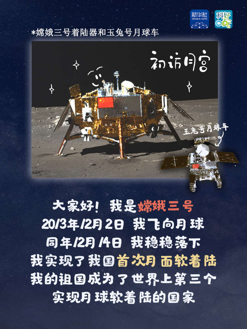 与一号、二号姐姐不同,我是由着陆器和玉兔号月球车组成的登月机器人。我一举完成“巡天、观地、测月”三大任务——完成了天体普查、获得了地球等离子体层图像、完成了月球地质剖面图。