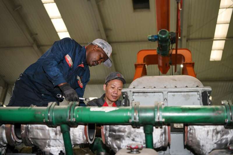 跟随中国老师张程熟悉操作流程。蒙内铁路首发列车由肯尼亚历史上首批女司机驾驶。