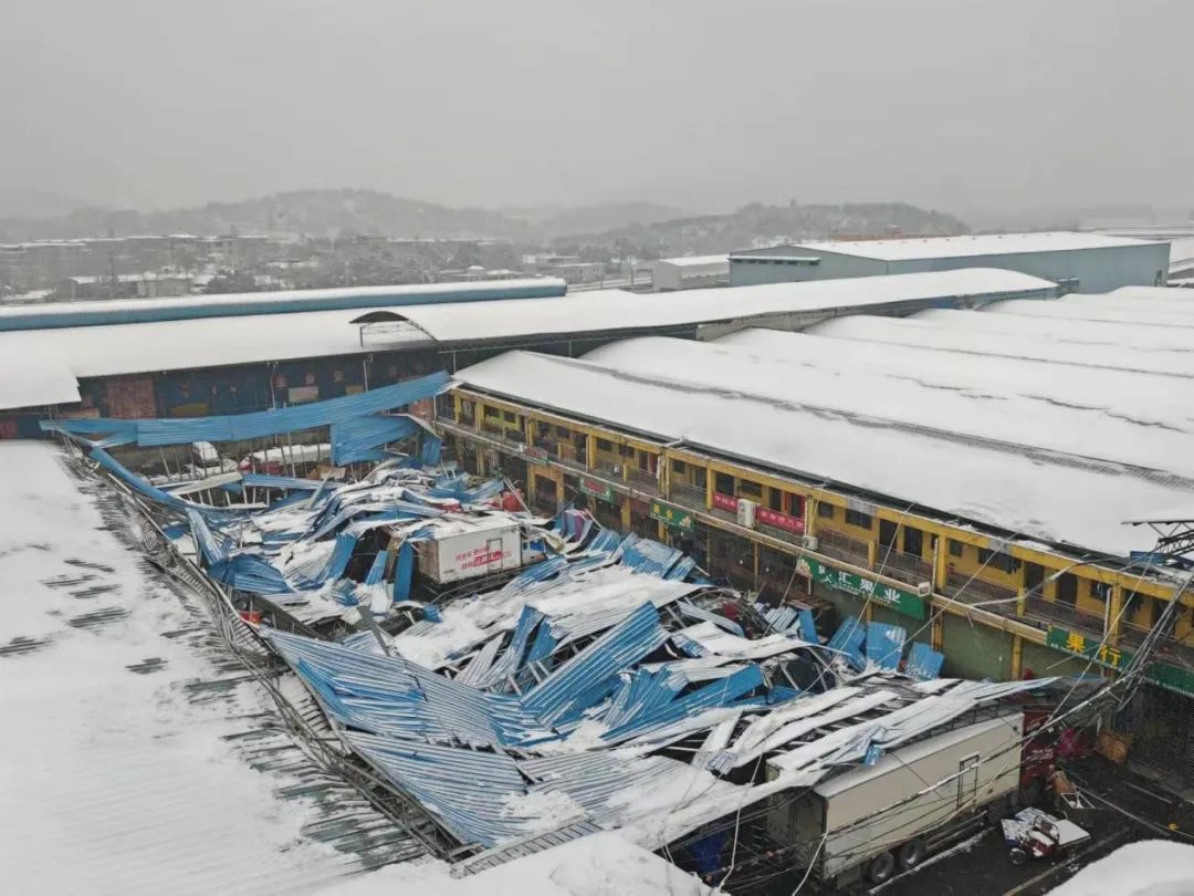 1月22日14时10分,义捷湘南水果大市场公共厕所前面的顶棚因积雪过多出现垮塌险情,湘南物流园工作人员立即告知郴江街道并报北湖区应急指挥中心。湘南物流园、郴江街道立即派员赶赴现场进行处置。北湖区应急指挥中心迅速调度区应急管理局、区消防大队等有关部门及结构专家第一时间赶到现场。区人民政府分管领导靠前指挥及时组织相关部门进行会商研判,立即决定组织人员转移,将正在进行水果批发的商户和群众撤离转移至安全地带,并在隐患区域拉起警戒线隔离,区域外围安排人员值守,严禁人员和车辆进入隐患区域。