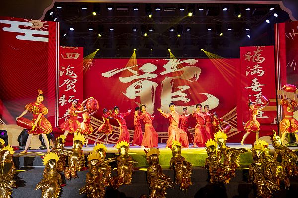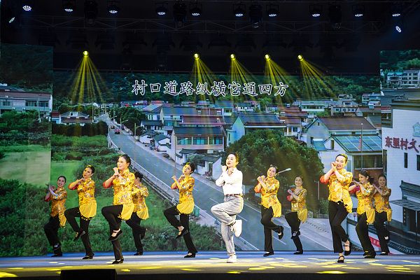 2024年1月24日,浙江绍兴,梅渚村文化礼堂内,上虞区下管镇东里村参演队员正在表演情景歌舞剧《我与美丽乡村同行》。