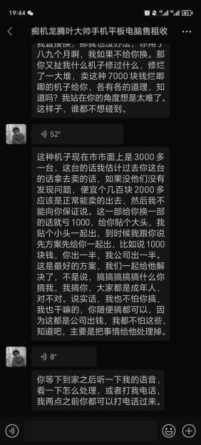 无独有偶,广州消费者瑞瑞也遇到了租机带来的糟心事。瑞瑞告诉《中国消费者报》记者,为了公司直播,她在人人租平台租了一台99成新的手机,租赁周期为一个月。但货到后发现手机话筒、听筒都无法使用,便要求退款,但商家告知要收取7天违约金。无奈之下,她只好接受商家的换机方案并支付了邮费。