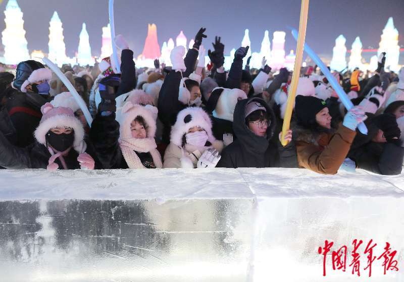 1月24日,哈尔滨冰雪大世界,年轻的游客在用冰砖垒成的栅栏边唱歌,与台上的冰雪主题演出互动。据了解,目前,哈尔滨凭借其独特的冰雪文化、得天独厚的冰雪资源、接地气的东北氛围成功出圈,成为这个冬天网络上最火的旅游目的地之一。这些天,在黑龙江省的两会上,有政协委员建议哈尔滨冰雪大世界尽快申遗,提升当地城市形象和知名度,推动文旅产业发展。中青报·中青网记者 陈剑/摄