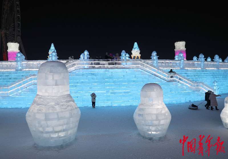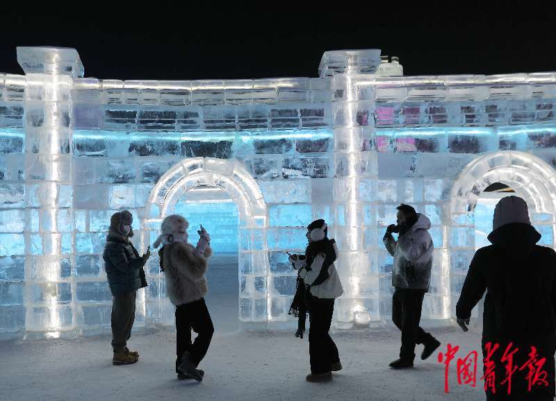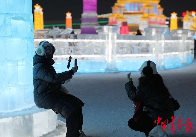 1月24日,哈尔滨冰雪大世界,年轻的游客在用冰砖垒成的栅栏边载歌载舞。中青报·中青网记者 陈剑/摄