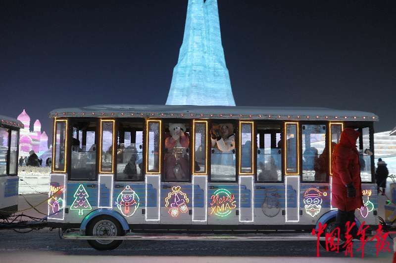 1月24日,哈尔滨冰雪大世界,游客坐在观光小火车里向外拍照。中青报·中青网记者 陈剑/摄