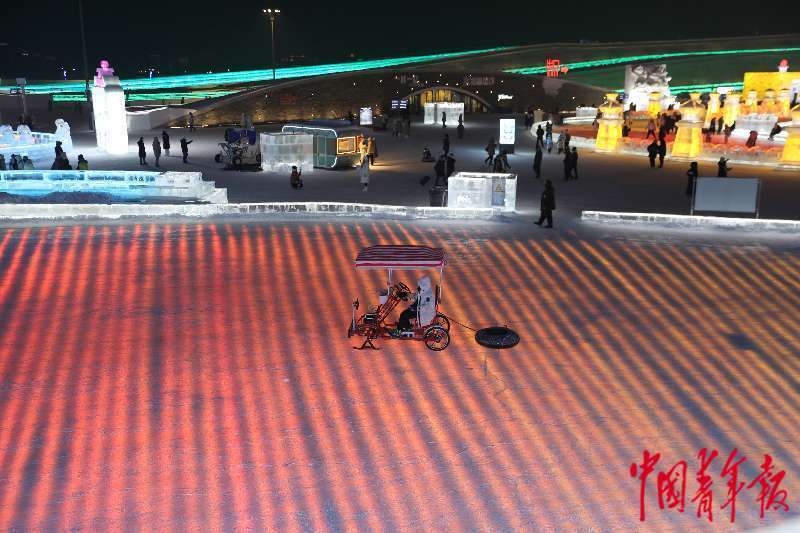 1月24日,哈尔滨冰雪大世界,游客在一处夜间灯光冰场玩冰车。中青报·中青网记者 陈剑/摄