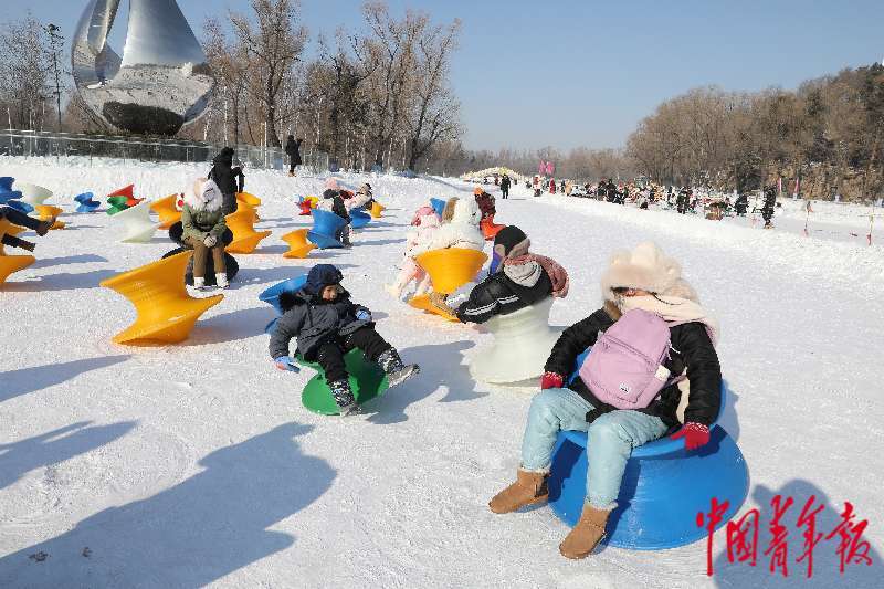 1月25日,哈尔滨太阳岛雪博会现场,游客正在座椅陀螺上开心地玩耍。中青报·中青网记者 陈剑/摄