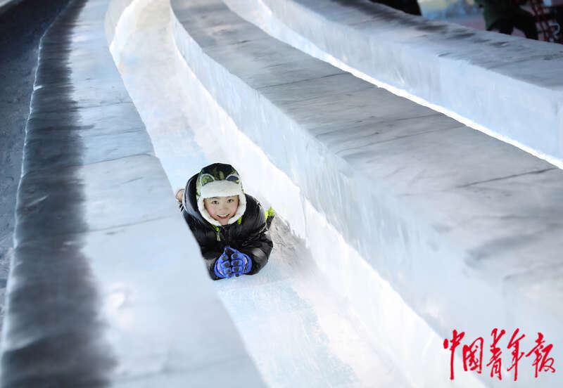1月24日,哈尔滨冰雪大世界,一名小朋友在滑冰滑梯。中青报·中青网记者 陈剑/摄
