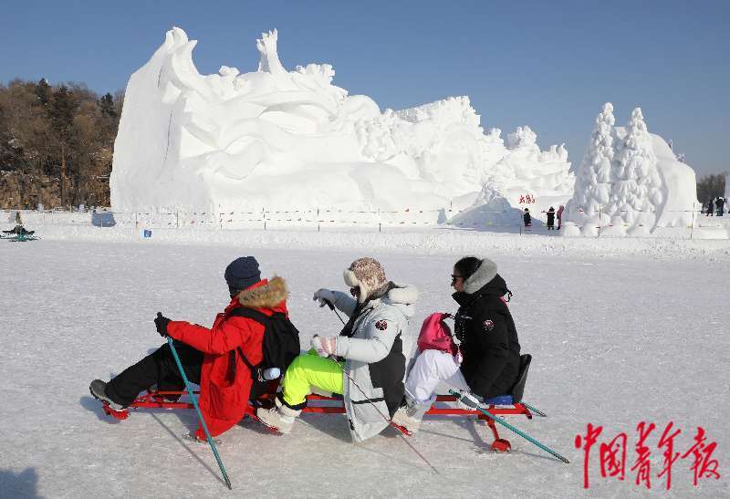 1月25日,哈尔滨太阳岛雪博会现场,游客正在滑冰车。中青报·中青网记者 陈剑/摄