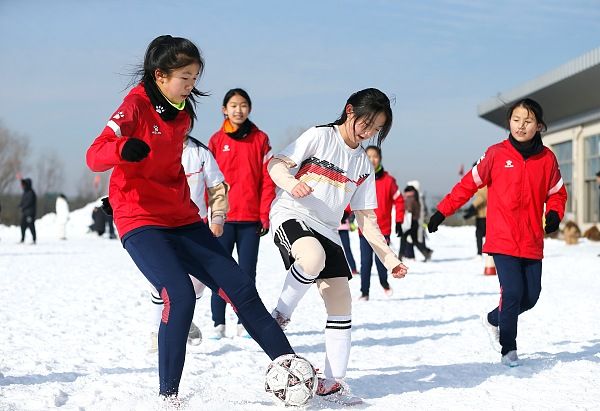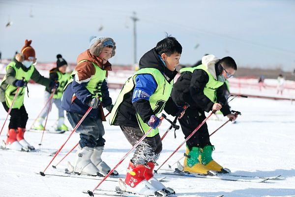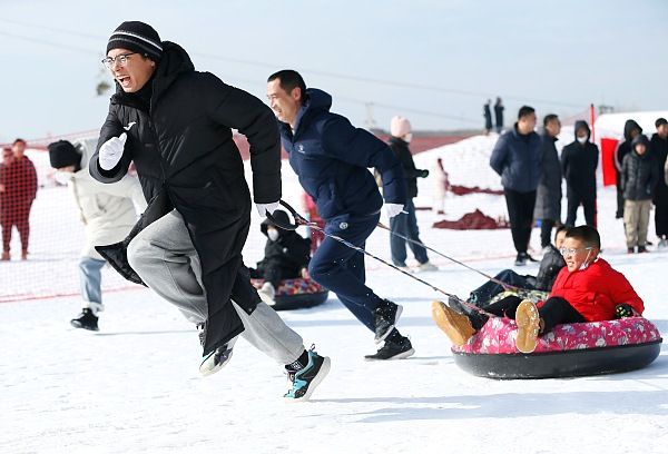 2024年1月25日,青岛,寒假期间,即墨区众多中小学生走进位于即墨区金口镇的丁字湾金山滑雪场,在专业老师的指导下开展雪上拔河、足球比赛、雪圈拉力、冰球射击等丰富多彩的活动,孩子们在体验冰雪运动中增强体质,乐享假期。