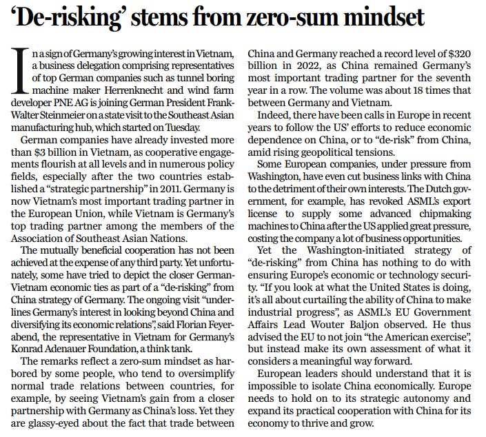 德国与越南互利合作,并不是以牺牲第三方利益为代价,但一些人却试图将两国愈加紧密的经济关系,描述成是德国对华“去风险”战略的一部分。德国智库康拉德· 阿登纳基金会驻越南代表弗洛里安·费耶阿本德(Florian Feyerabend)表示,德国总统出访越南“凸显德国希望在中国之外寻求经济关系多样化。”