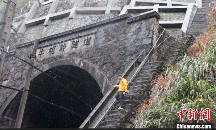 迎着雨雪差不多走了十分钟才抵达目的地。邓佳兴鼻子冻得通红,头发上落了一层雪,仔细检查了应急备品,又顶着雨雪攀登而上。他说:“前段时间,这里有处钢轨焊缝核伤需要加固,我拎着20斤重的鼓包夹板,两分钟就跑下来了。今天台阶湿滑,比平时走得更慢。”