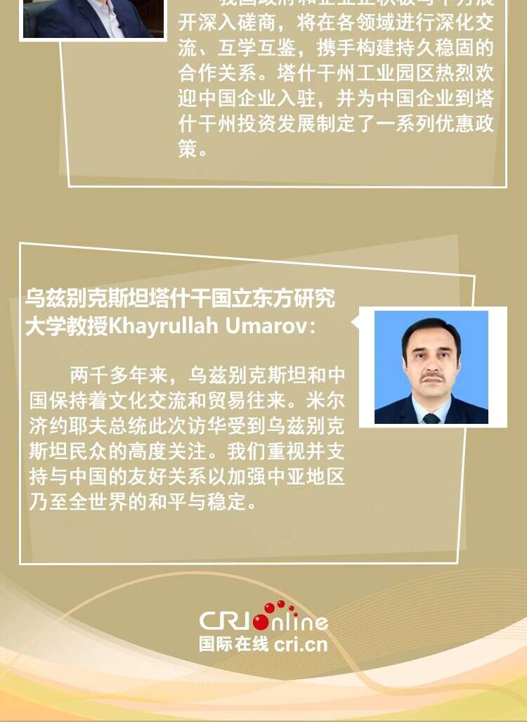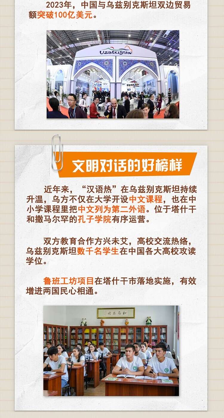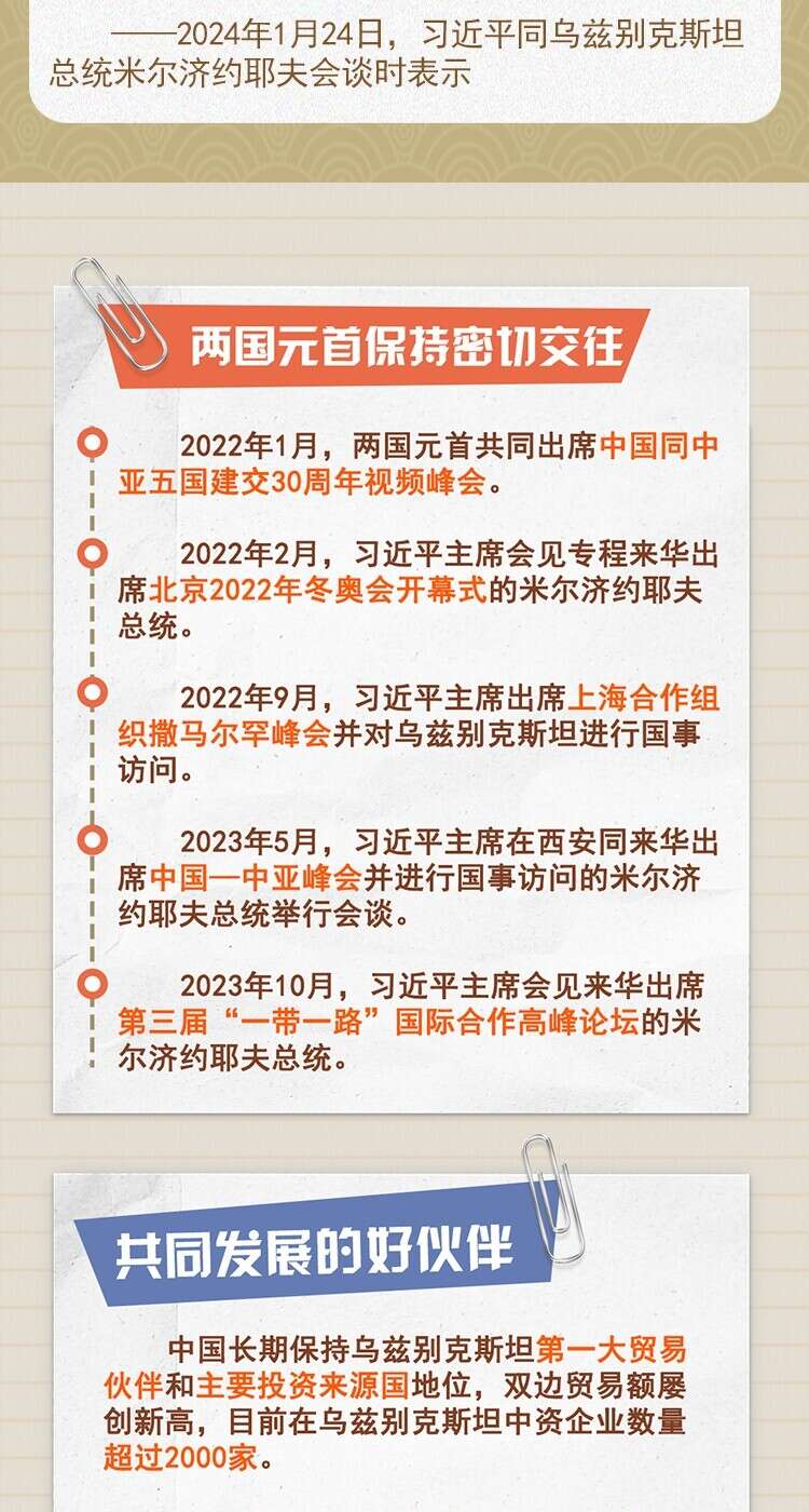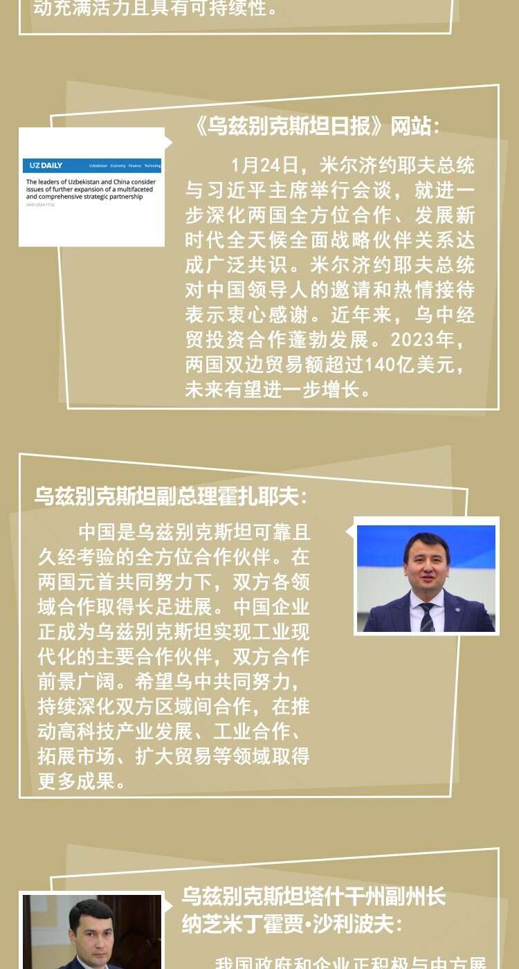 米尔济约耶夫总统2024年首次出访即是中国,此行受到乌兹别克斯坦国内舆论的高度关注,称赞两国关系正处于发展的最佳阶段,是双边交往的典范。