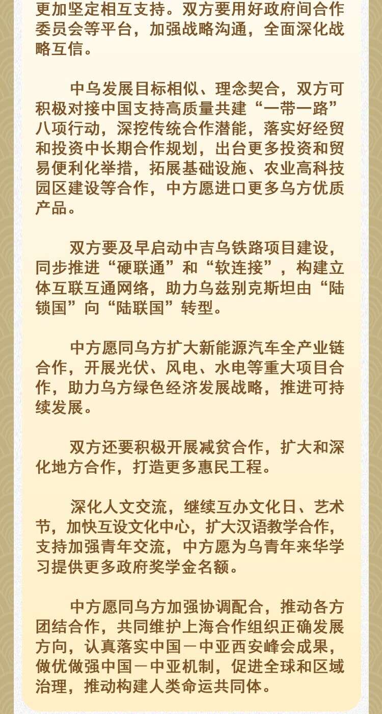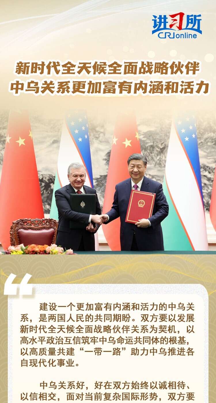 1月24日,中国国家主席习近平同来华进行国事访问的乌兹别克斯坦总统米尔济约耶夫举行会谈。两国元首宣布,中乌决定发展新时代全天候全面战略伙伴关系,在更高起点上推动构建中乌命运共同体。