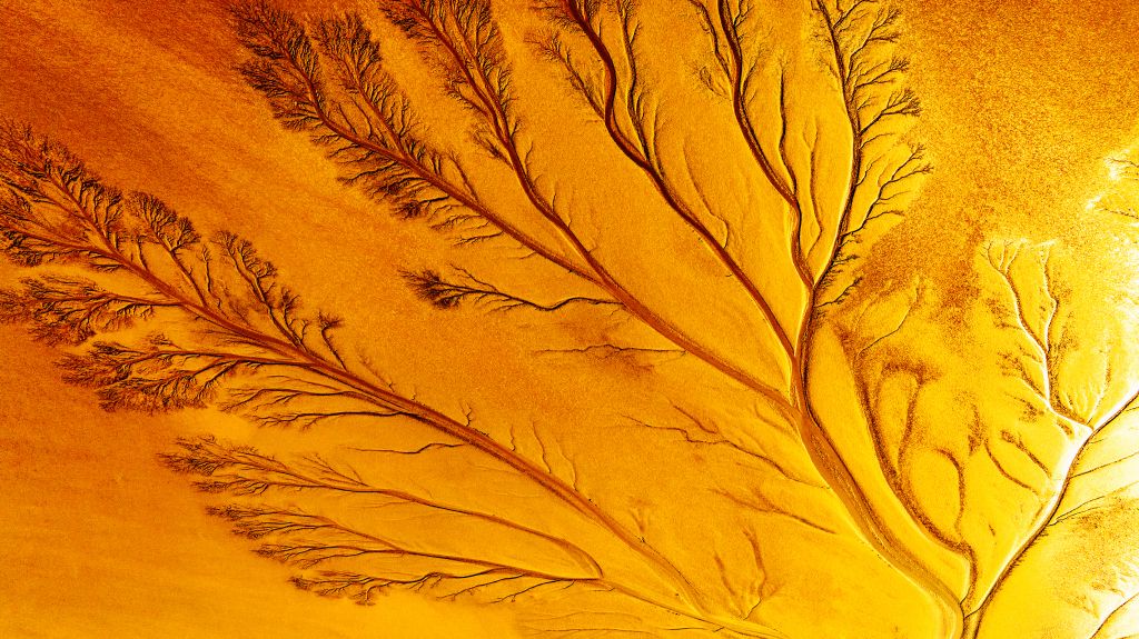 2024年1月25日,浙江省嘉兴市,钱塘江现“潮汐树”,金色朝霞洒满滩涂。