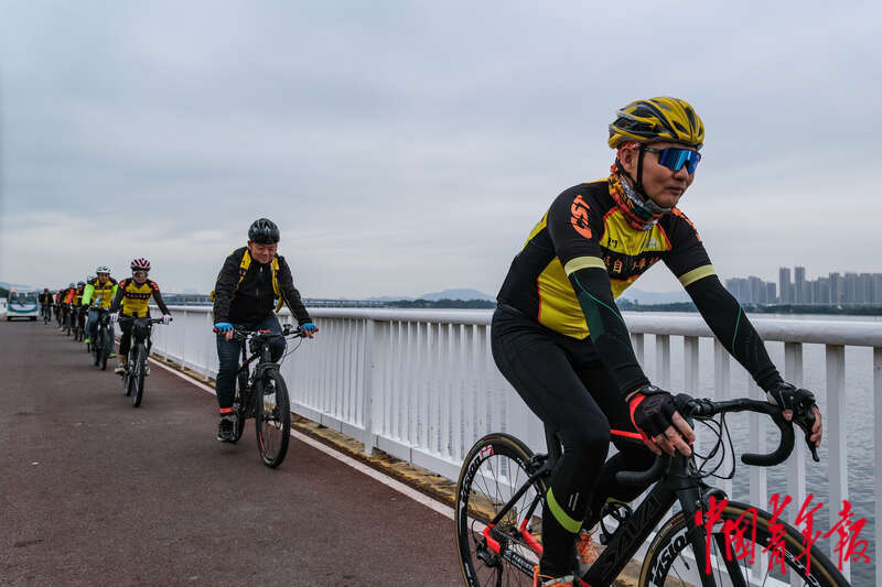 1月25日,福建厦门,集美区杏林湾,集美区自行车协会会长陈明福(右一)带领会员在沿海栈道骑行。陈明福介绍,“现在的杏林湾空气很好,每天都有车友过来骑行”。中青报·中青网记者 张玉佳/摄