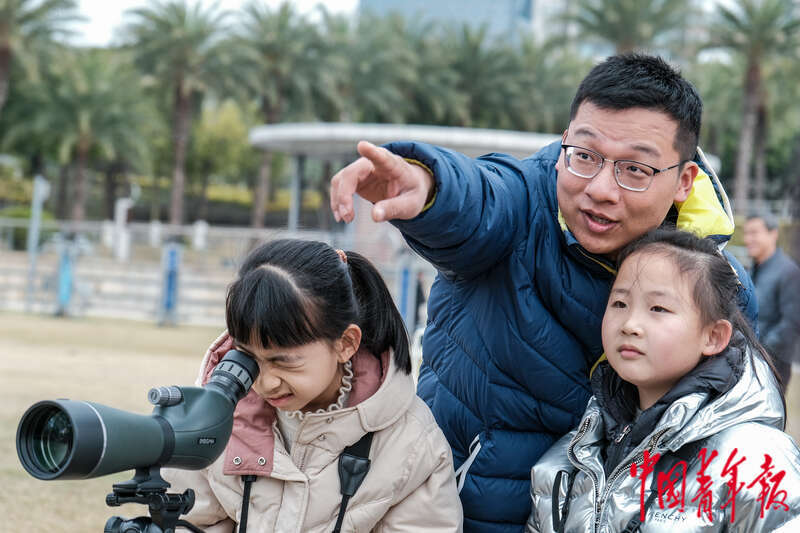 1月25日,福建厦门,集美区杏林湾,观鸟协会会员黄志泉(中)带学生们观看鹭鸟。杏林湾位于集美新城中心,21世纪初,杏林湾因周边居民长期围湾造地、不加节制地水产养殖,生态环境脆弱不堪。在经过截污清淤、建闸筑景等生态修复工作后,如今的杏林湾水面开阔,动植物种类丰富,已成为重要的生态湿地和鸟类栖息繁衍基地。据统计,湾区有国家Ⅱ级重点保护动物6种,在厦门已消失144年的国家一级保护鸟类紫水鸡也在这里被发现。中青报·中青网记者 张玉佳/摄