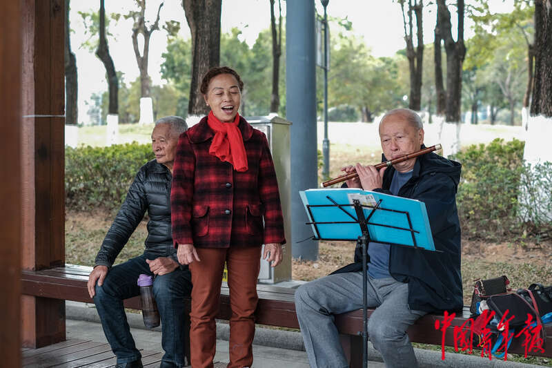1月26日,福建厦门,苏颂公园,市民正在公园长廊歌唱、演奏。苏颂公园位于同安区东西溪畔,东西溪从同安城区穿流而过,流域总面积在全市占比62.53%,是厦门市流域面积最大、水环境治理任务最重的城区。开展流域治理以来,同安区坚定“生态立区”,聚焦农村生活污水收集、农业面源污染防治等重点,将水生态治理链接民生。2022年至2023年,东西溪获评厦门市“最幸福”河流。中青报·中青网记者 张玉佳/摄
