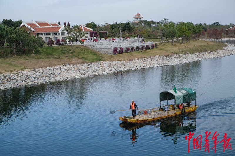 1月24日,福建厦门,马銮湾生态三岛公园,一位渔夫正在打捞河面垃圾。马銮湾原为22平方千米的半封闭海湾,曾经,马銮湾区因大量水域被围占养殖导致水质严重下降。2016年,马銮湾片区启动生态修复工程,通过退垦还海、清淤整治,累计清退马銮湾内鱼塘虾池约14.95平方千米,水面面积扩大至8平方千米。如今的马銮湾拥有长达25千米的环湾生态景观带和76公顷的城市湿地公园,绿化覆盖率大于50%。中青报·中青网记者 张玉佳/摄