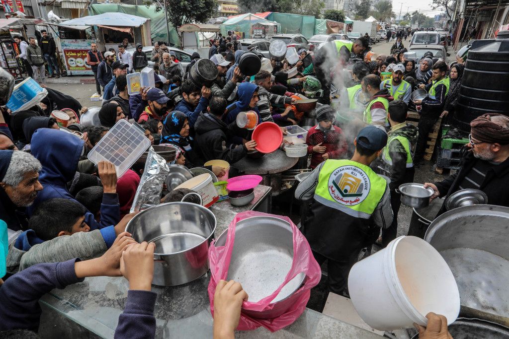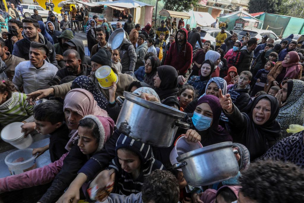 当地时间2024年1月26日,巴勒斯坦加沙地带,拉法地区流离失所的巴勒斯坦人在等待分发食物。