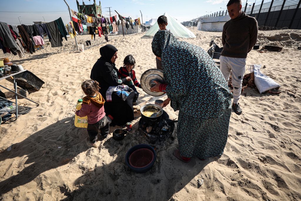 当地时间2024年1月21日,巴勒斯坦加沙地带,拉法地区的一个靠近埃及边境的难民营内,一户巴勒斯坦人正在做午饭。