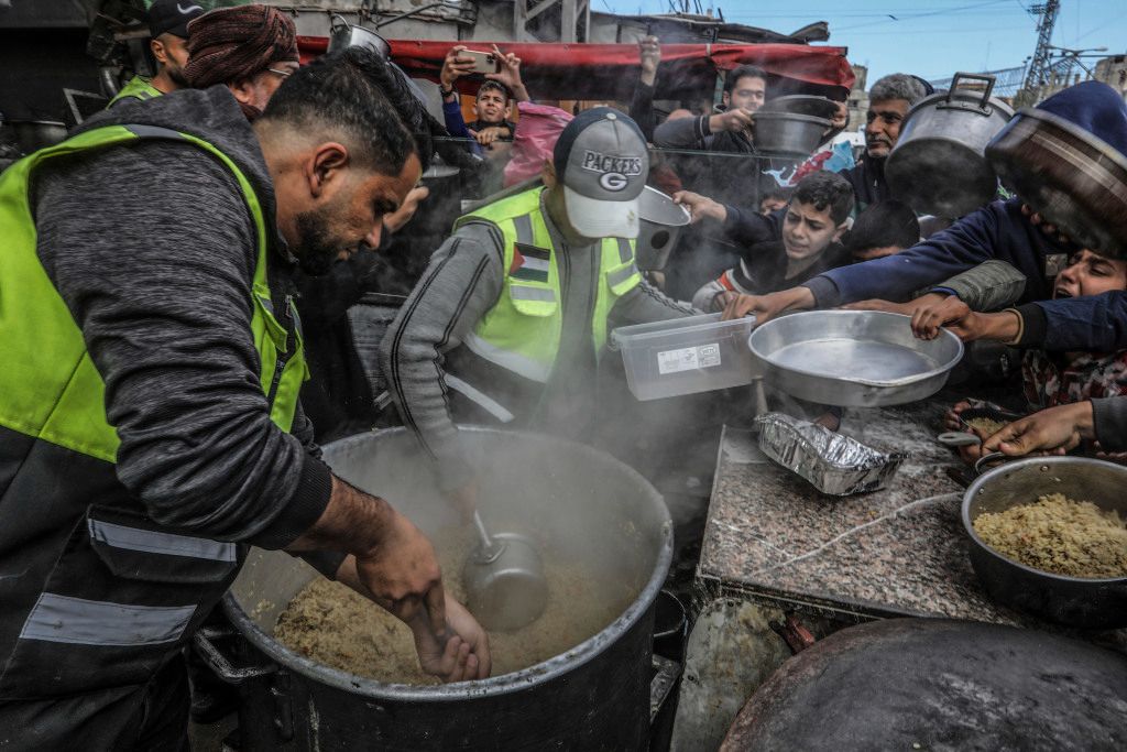 当地时间2024年1月26日,巴勒斯坦加沙地带,志愿者向拉法地区流离失所的巴勒斯坦人分发食物。