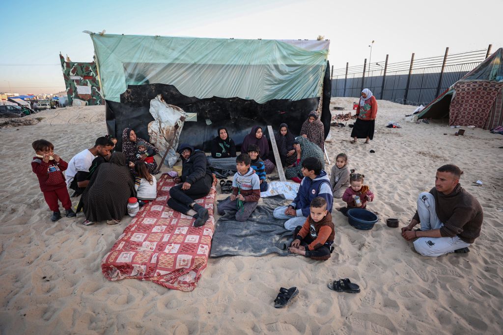当地时间2024年1月21日,巴勒斯坦加沙地带,拉法地区的一个靠近埃及边境的难民营内,一户巴勒斯坦人在临时帐篷外。