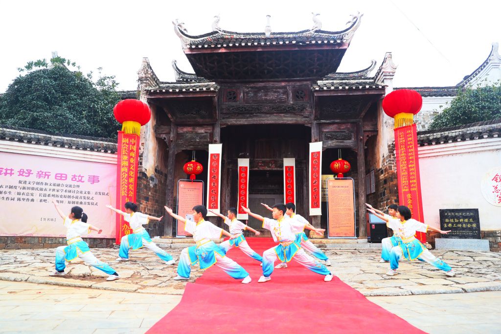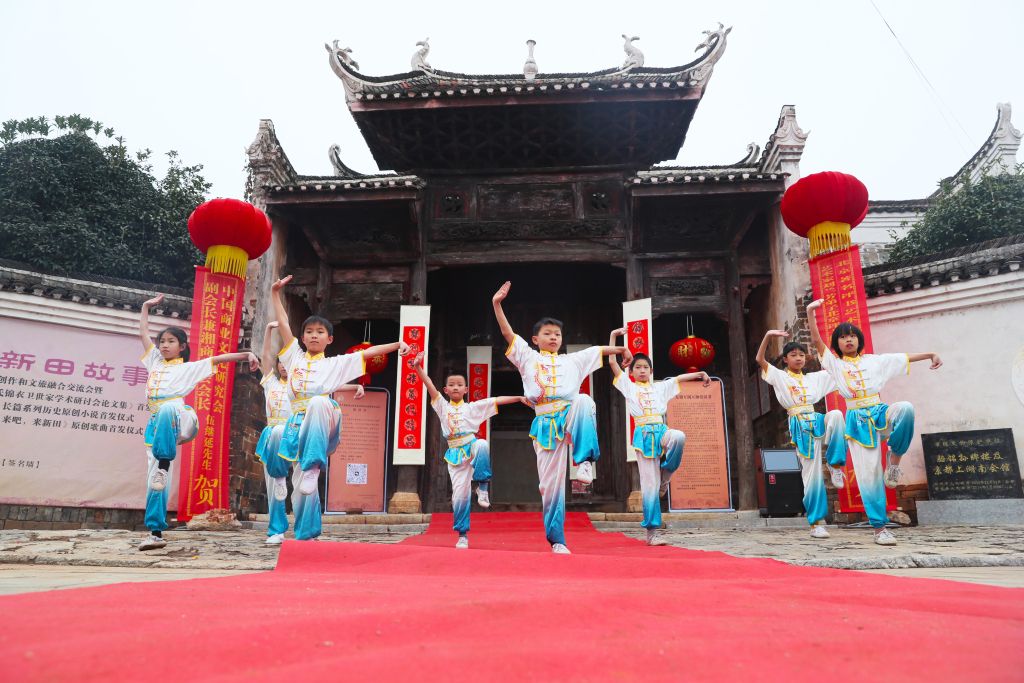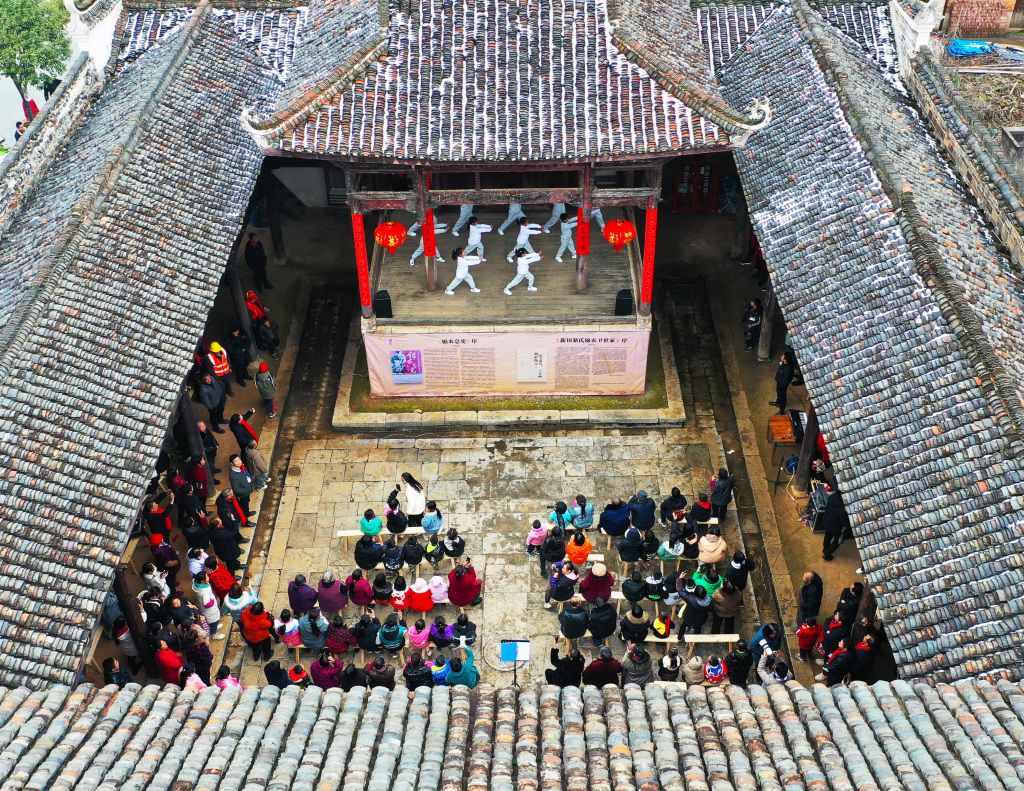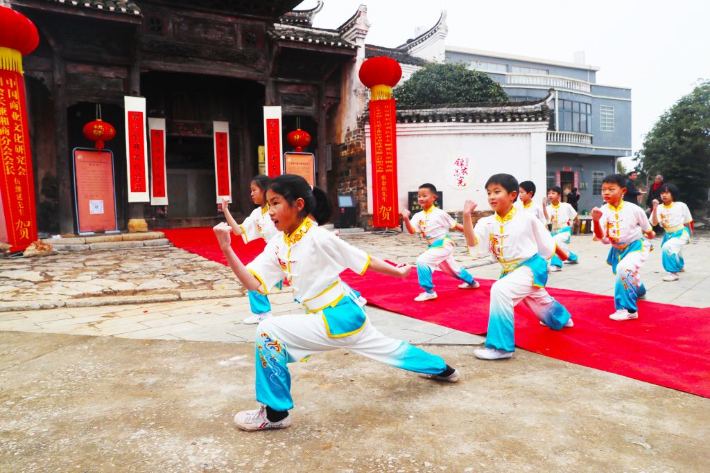 2024年1月26日,湖南省永州市新田县金盆镇骆铭孙古村,学生在给游客表演传统武术。