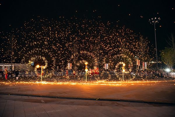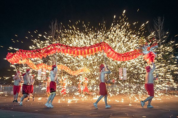 1月26日,重庆,非物质文化遗产铜梁铁水钢花火龙表演举行,迎接龙年春节的到来。