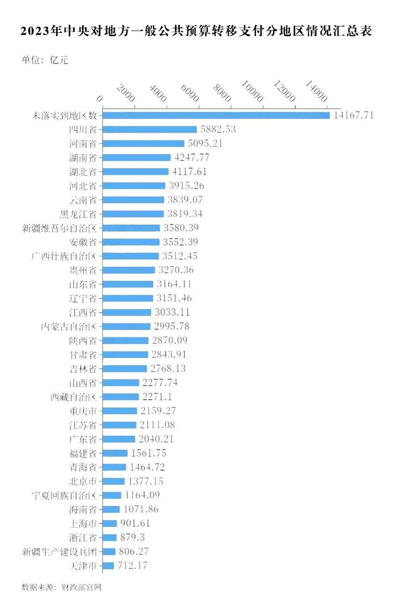 2023年中央给地方10万亿转移支付的钱,按照预算,有两个人口大省分别得到了超过5000亿元。广西得到了超过3500亿元,青海、宁夏各超过了1000亿元,可以说,在经济欠发达地区,这笔钱都大大超过了当地一般预算收入,强力支撑了当地兜住、兜准、兜牢民生底线。