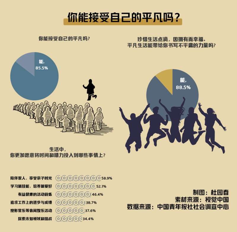 日前,中国青年报社社会调查中心联合问卷网(wenjuan.com),对1500名青年进行的一项调查显示,85.5%的受访青年能接受自己的平凡。88.5%的受访青年明确,平凡生活能带给自己书写不平庸的力量。陪伴家人、享受亲子时光是受访青年最愿意花时间做的事。