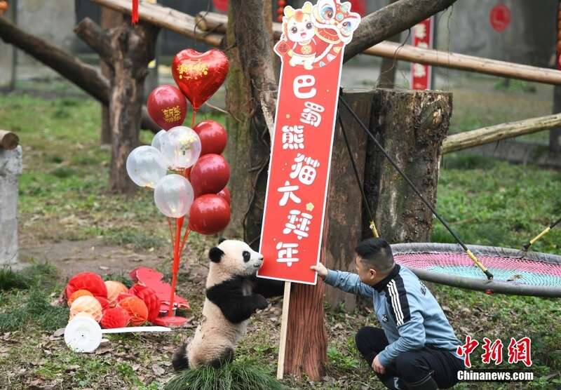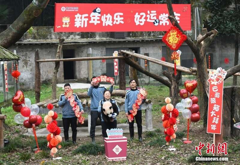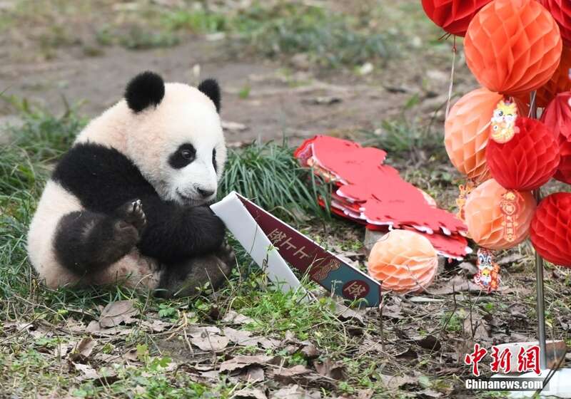 活动现场,新春饰品吸引大熊猫“莽灿灿”一探究竟。