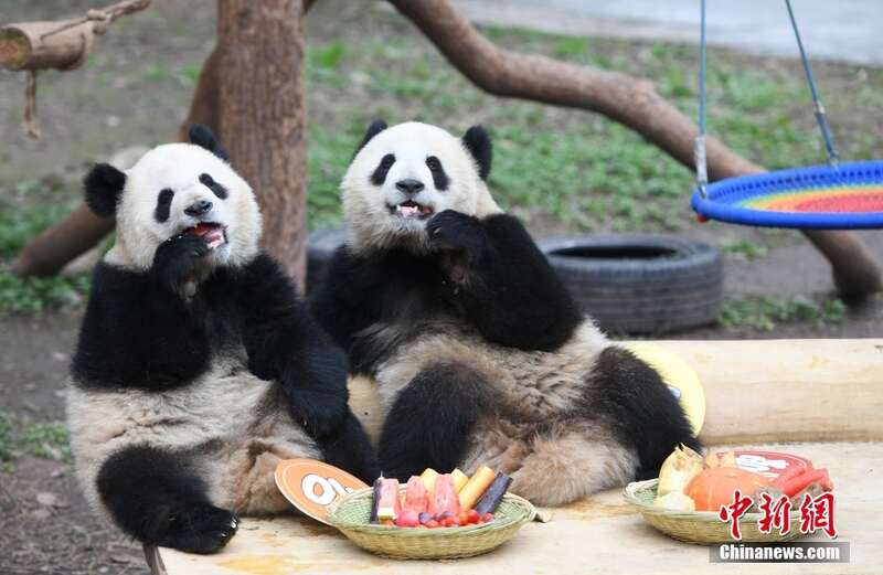 活动现场,大熊猫“渝可”(右)“渝爱”(左)享用“五谷丰登”年味大餐。
