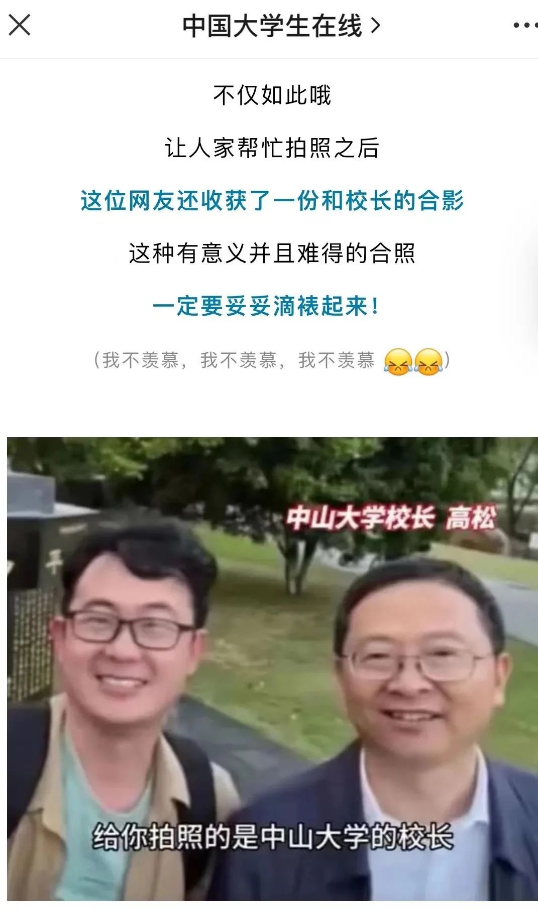 去年,还有一位网友游浙江大学校园时,竟然“抓”来了中山大学校长给自己和孙中山先生像留影,当时旁边还有浙江大学校长。后面,网友还收获了和校长的合影。