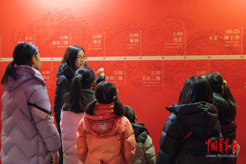 1月31日,在“紫禁城里过大年”数字文化节的数字展览馆内,工作人员正向小朋友们介绍乾隆皇帝的“元日起居”。实习生 张郝苗/摄
