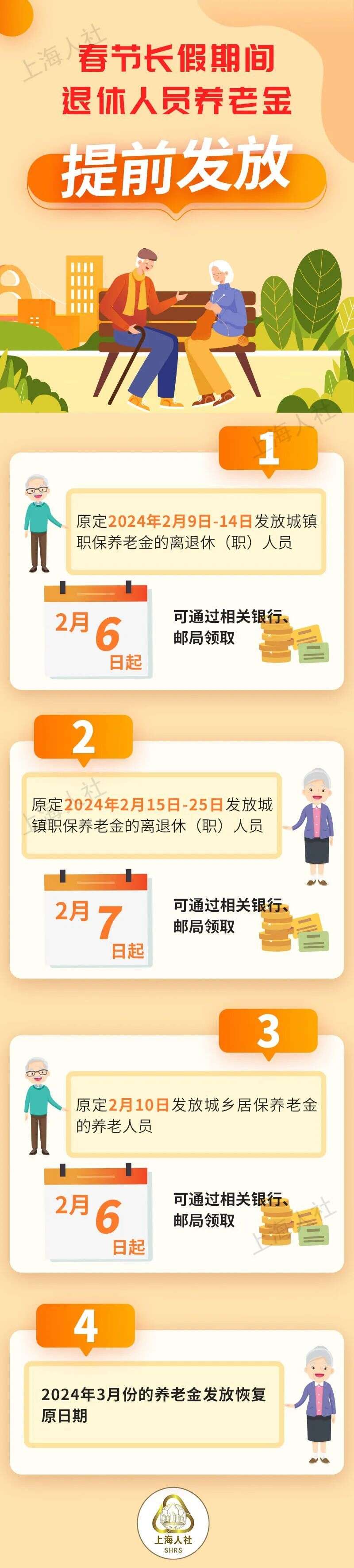 1月31日,上海市人社局发文称,将对春节长假期间发放的离退休(职)人员养老金提前发放, 具体安排如下: