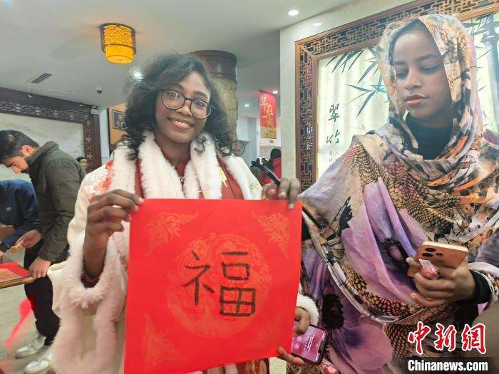 “我在巴基斯坦读书的时候就知道中国人过年喜欢红色,会发红包、贴对联,今天终于体会到这种喜庆气氛,还知道了‘福’字倒过来写是表示‘福到了’。”湖南中医药大学巴基斯坦籍学生杜锐芒拿毛笔用乌尔都语写下“新年快乐”。