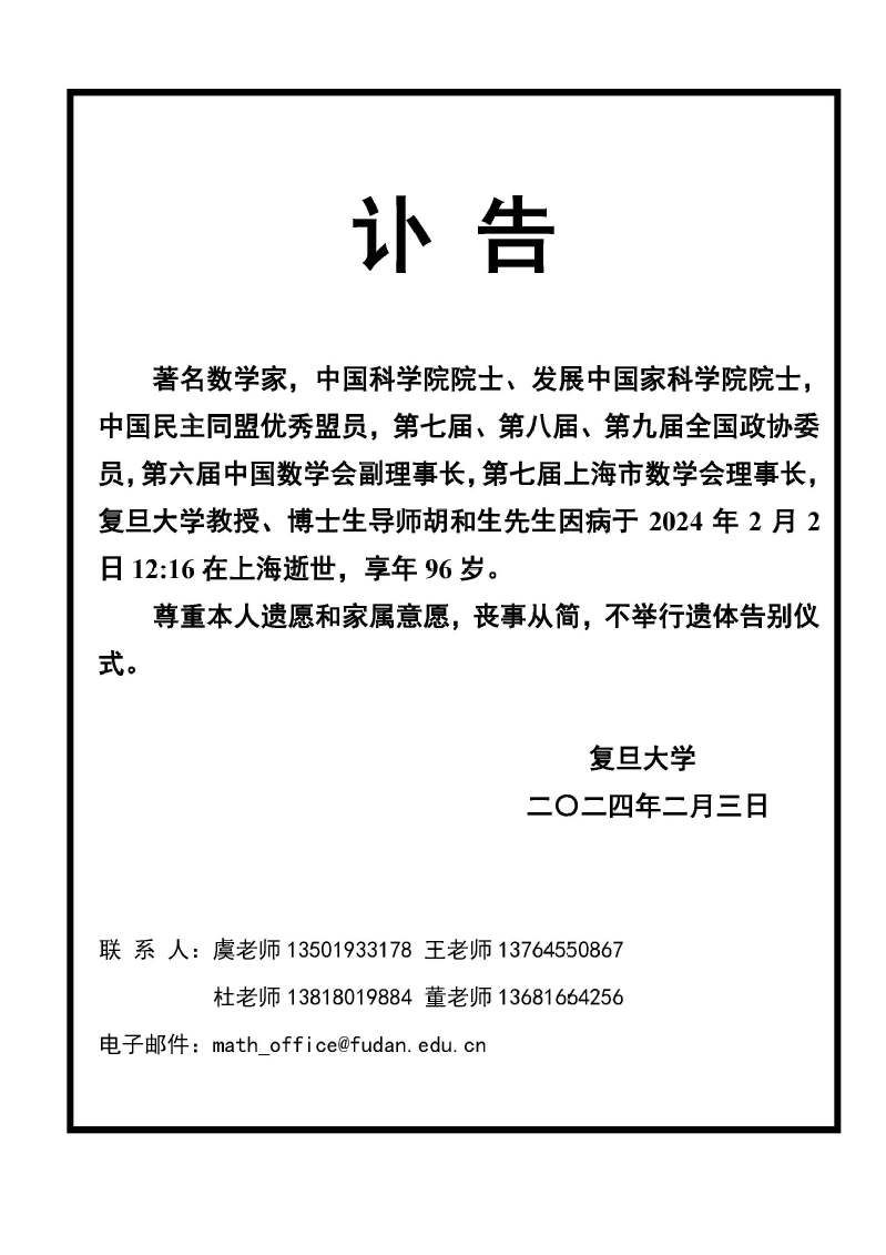 著名数学家、中科院院士胡和生因病在沪逝世,享年96岁