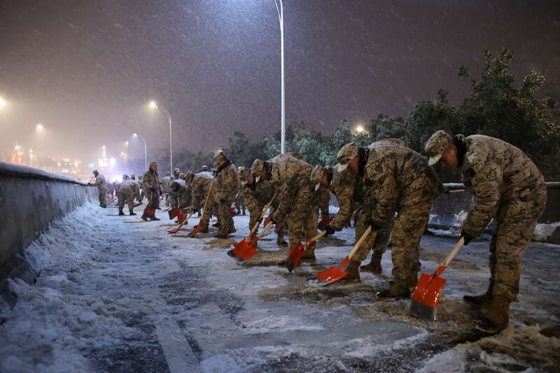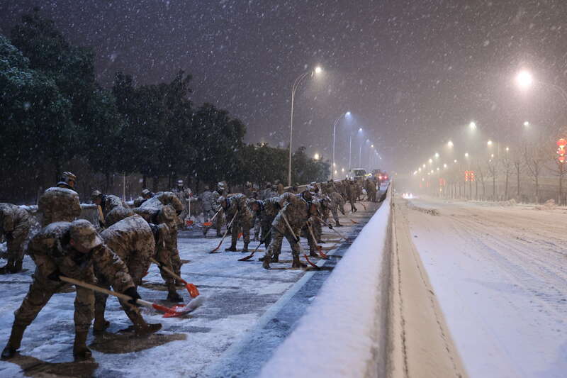2月4日凌晨,武警湖北总队训练基地接到驻地政府救援请求,驻地金山大道、临空港大道等周边多条高架和快速路匝道结冰,进出车辆通行受到严重影响,已发生多起车祸。2时30分许,他们紧急出动投入到破冰抢险工作中。至8时,累计清理结冰道路2公里,清扫积雪1.5万多平方米,受到地方政府和人民群众的高度赞誉。