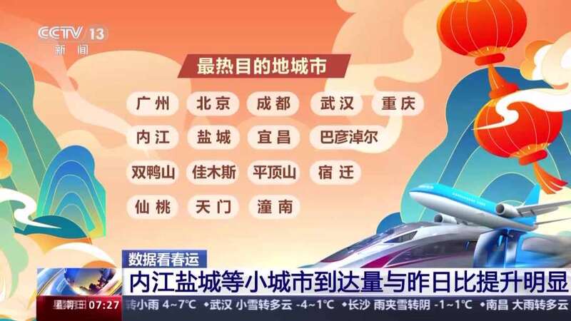 在最热的目的地城市里,除了广州、北京、成都、武汉、重庆这些连续多日排名靠前的城市,还有一批小城市的到达量跟昨天比明显提升,内江、盐城、宜昌、巴彦淖尔、双鸭山、佳木斯、平顶山、宿迁、仙桃、天门、潼南,回家过节的人们加快了返乡的步伐。