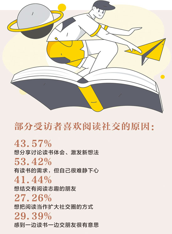 中青校媒调查显示,想分享讨论读书体会、激发新想法是部分受访者喜欢阅读社交的原因(43.57%)。此外,受访者愿意阅读社交的原因还包括有读书的需求,但自己很难静下心(53.42%);想结交有阅读志趣的朋友(41.44%);想把阅读当作扩大社交圈的方式(27.26%);感到一边读书一边交朋友很有意思(29.39%);等等。