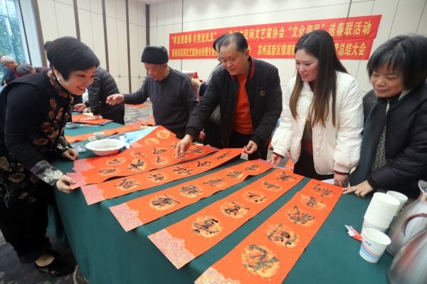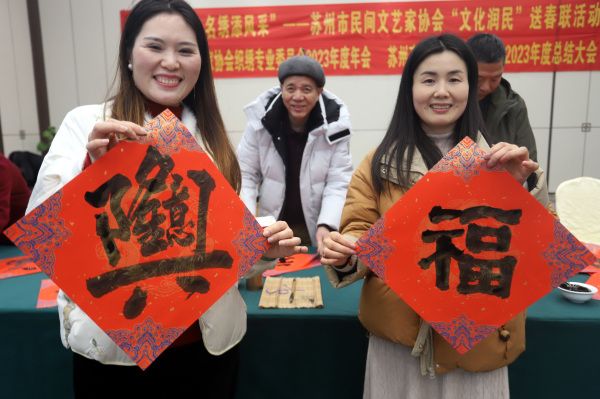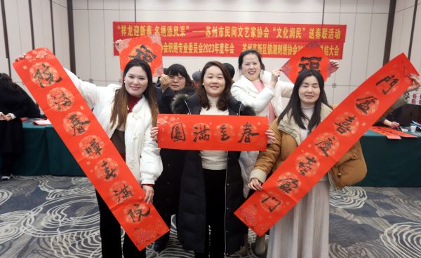 2024年2月4日,由苏州市民间文艺家协会、苏州高新区镇湖刺绣协会主办的“文化润民”送春联活动在苏州高新区镇湖街道举行,知名书法家挥毫泼墨,为镇湖街道的绣娘们免费写春联送祝福,感受传统文化,迎接即将到来的新春佳节。