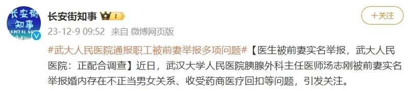 去年12月,武汉大学人民医院胰腺外科主任医师汤志刚被前妻实名举报婚内存在不正当男女关系、收受药商医疗回扣等问题,引发关注。