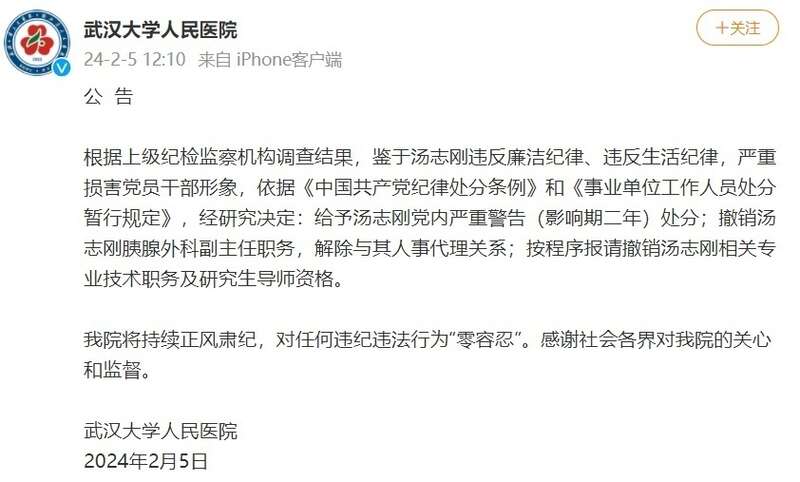 武汉大学人民医院2月5日通报上述事件调查结果,决定给予汤志刚党内严重警告(影响期二年)处分,撤销其胰腺外科副主任职务。