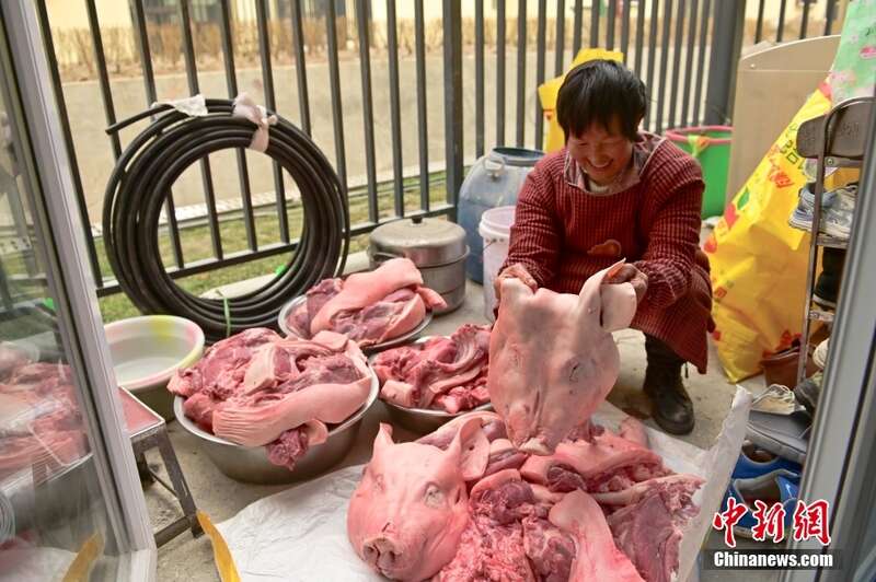 图为2月1日,搬进集中安置小区新房的村民熊尚全的爱人清理新鲜的年猪肉。