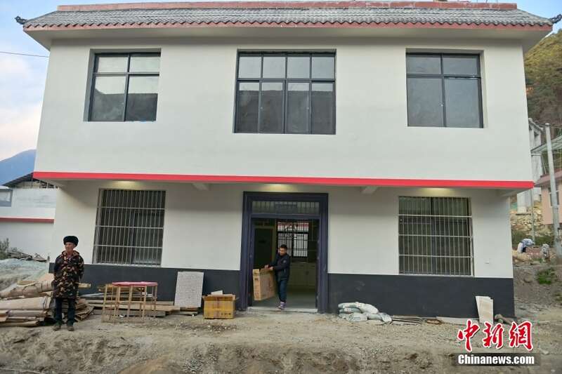 图为2月1日,泸定磨西镇村民曹忠全在新建楼房外清理新家具的包装材料。