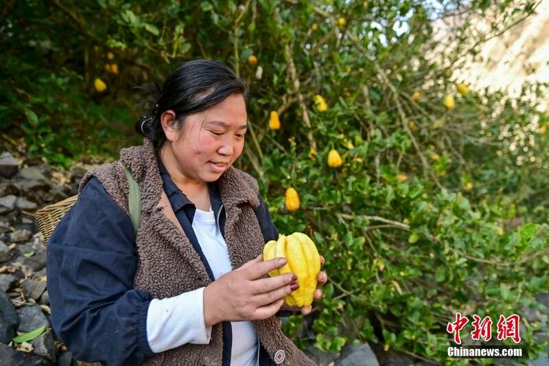 图为2月1日,湾东村村民赵冬梅在大山上采摘佛手柑。