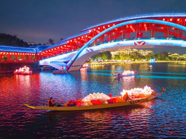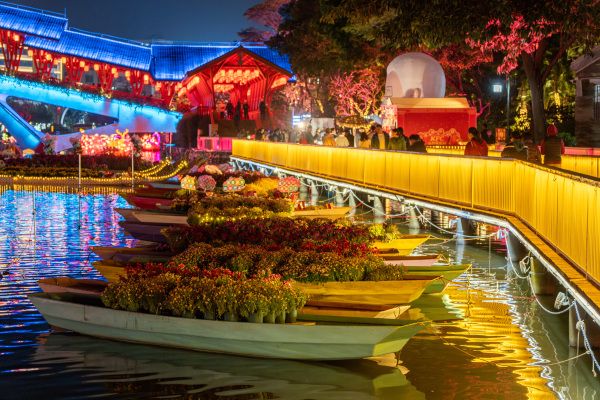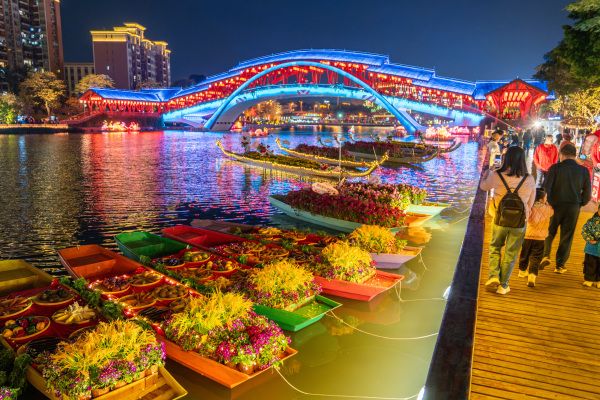 在广东佛山,逛花市是开启年味的传统活动。佛山开办的大湾区最美岭南水乡花市,不仅重现了千年前客商在岭南水乡上运货往来的热闹场景,还加入了不少创新元素,为市民游客提供赏水上飘色玩、水上巡游、品特色美食、祈来年好运等丰富活动,为传统中国年平添新浪漫。