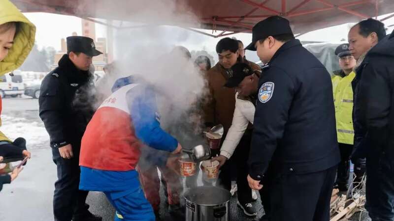 湖南省益阳市安化县红十字会在高速路口为滞留旅客提供热水和食品。中国红十字会总会供图。