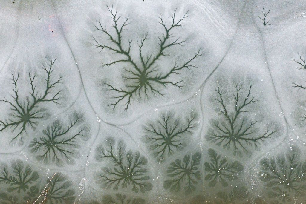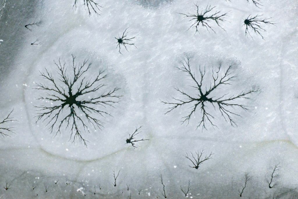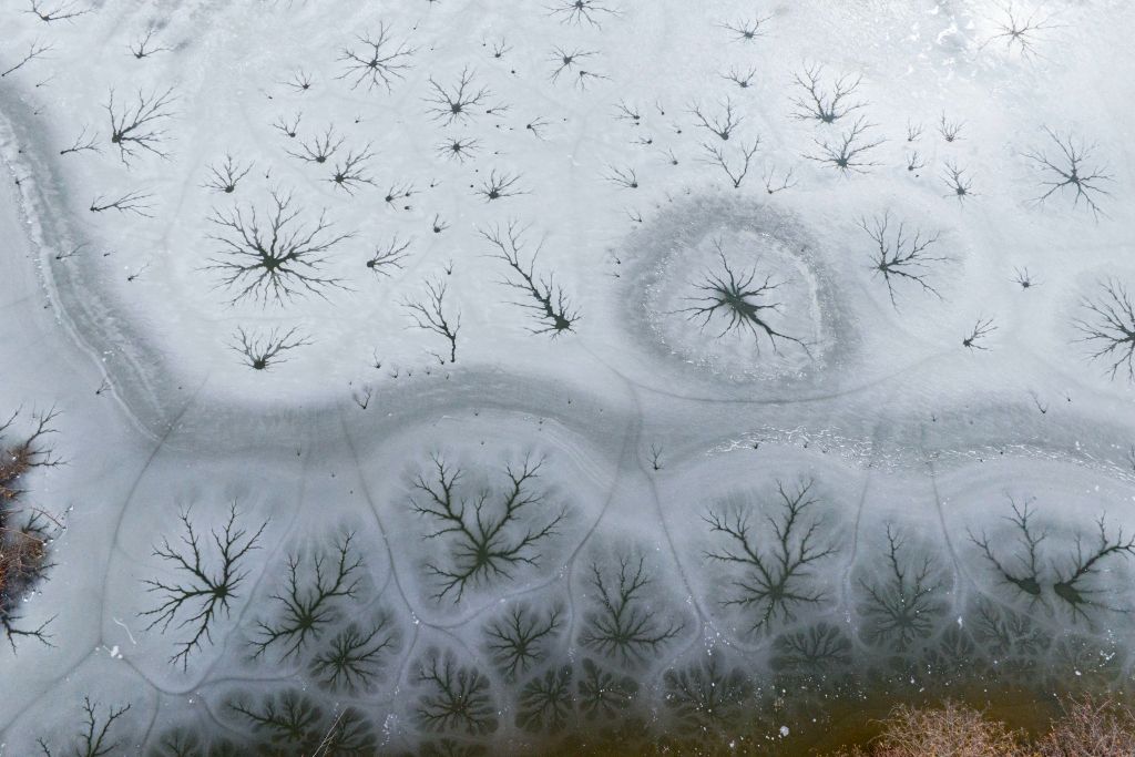 2024年2月6日,青岛西海岸新区王台街道徐村雪后乡野的冰湖上,出现了一片片冰树和冰花的图案景观。一棵棵冰树根系发达,向上生长惟妙惟肖;一朵朵冰花绚丽盛放,妙不可言,展示出大自然的鬼斧神工。